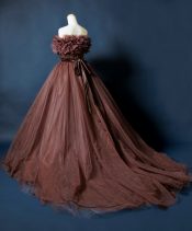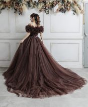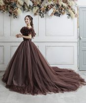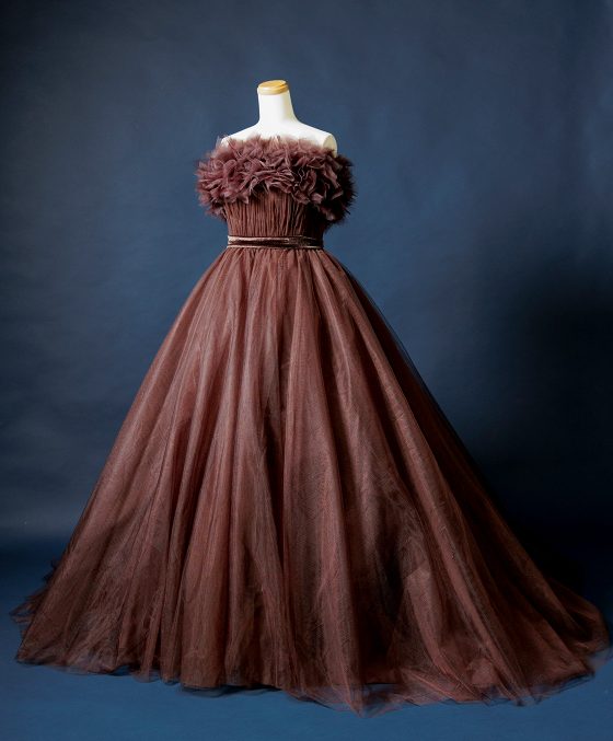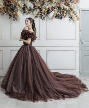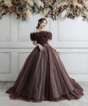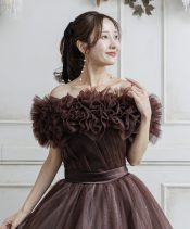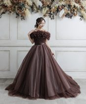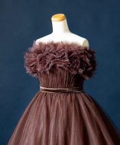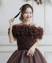 ボリューミーでふわふわした印象ですが、深みのあるブラウンカラーで大人可愛い1着♡オフショルダーがあることで、気になる胸周りや二の腕がカバーでき安心感があります。腰元にもポイントでベロアリボンが付けられ、おしゃれさが増します♥