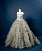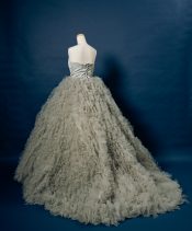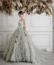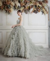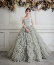 灰色がかった緑色セージグリーンが絶妙な色味で大人フェミニンな1着。シンプルなビスチェに足元を埋め尽くすようなボリューミーなフリルを合わせ、モードなエッセンスをプラス。甘すぎず可愛い1着♡
