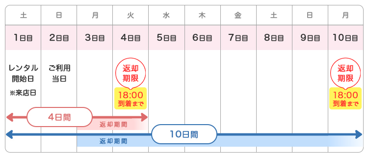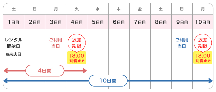 『レンタル開始日』〜『返却日』までのレンタル期間は、4日間(3泊4日) or 10日間(9泊10日)となります。レンタル開始日は、何曜日からでもご利用いただけます。