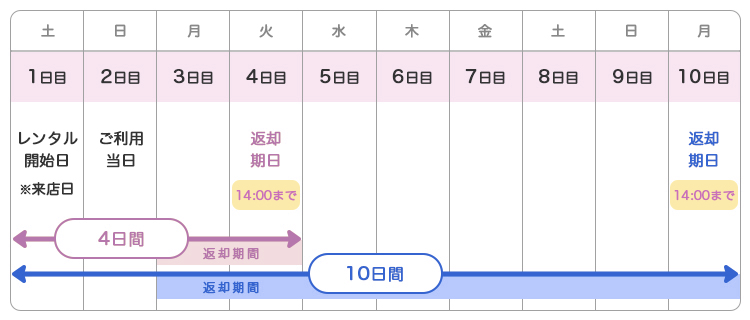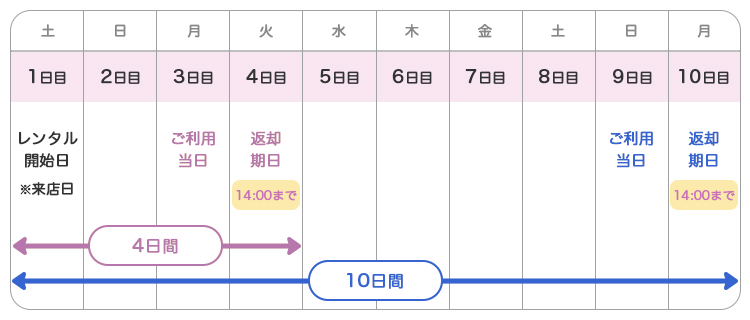 『レンタル開始日』〜『返却日』までのレンタル期間は、4日間(3泊4日) or 10日間(9泊10日)となります。レンタル開始日は、何曜日からでもご利用いただけます。