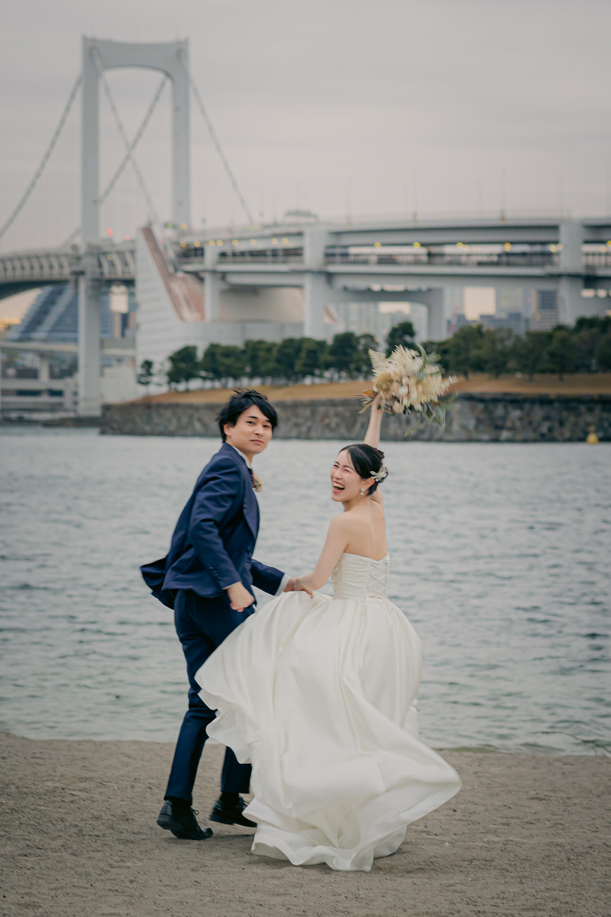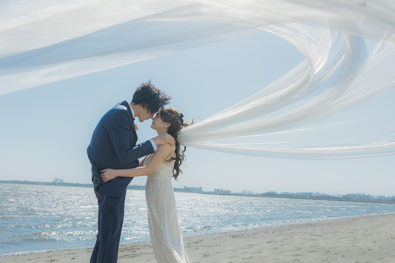 海風を最大限に活かすポーズ。ベールの動きがそのまま写真の世界観を作ります。