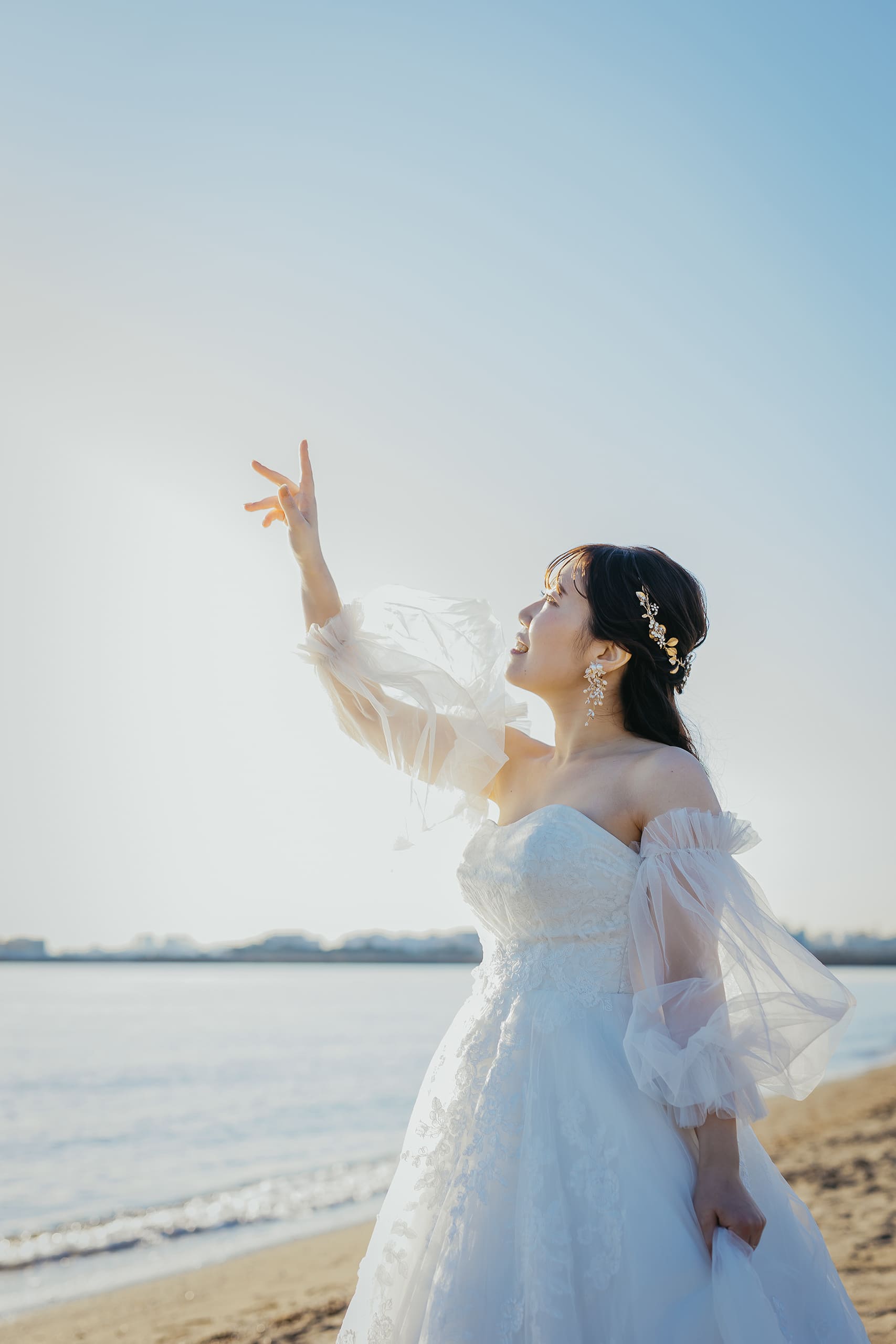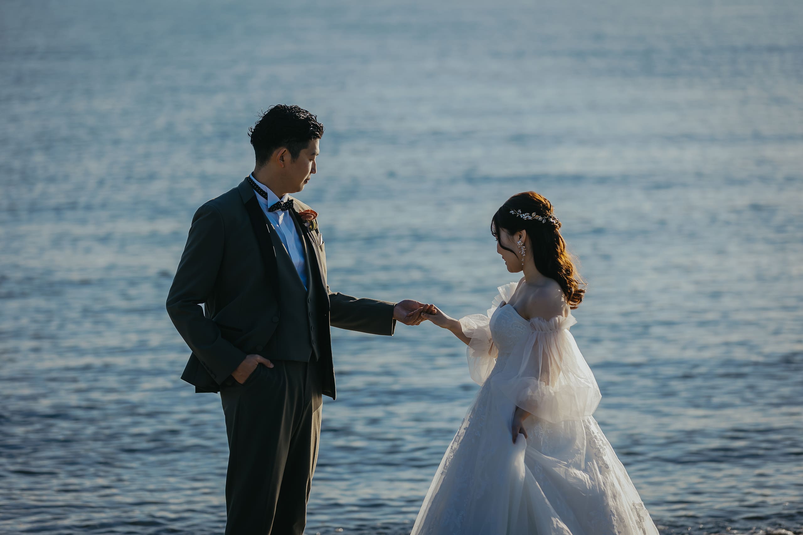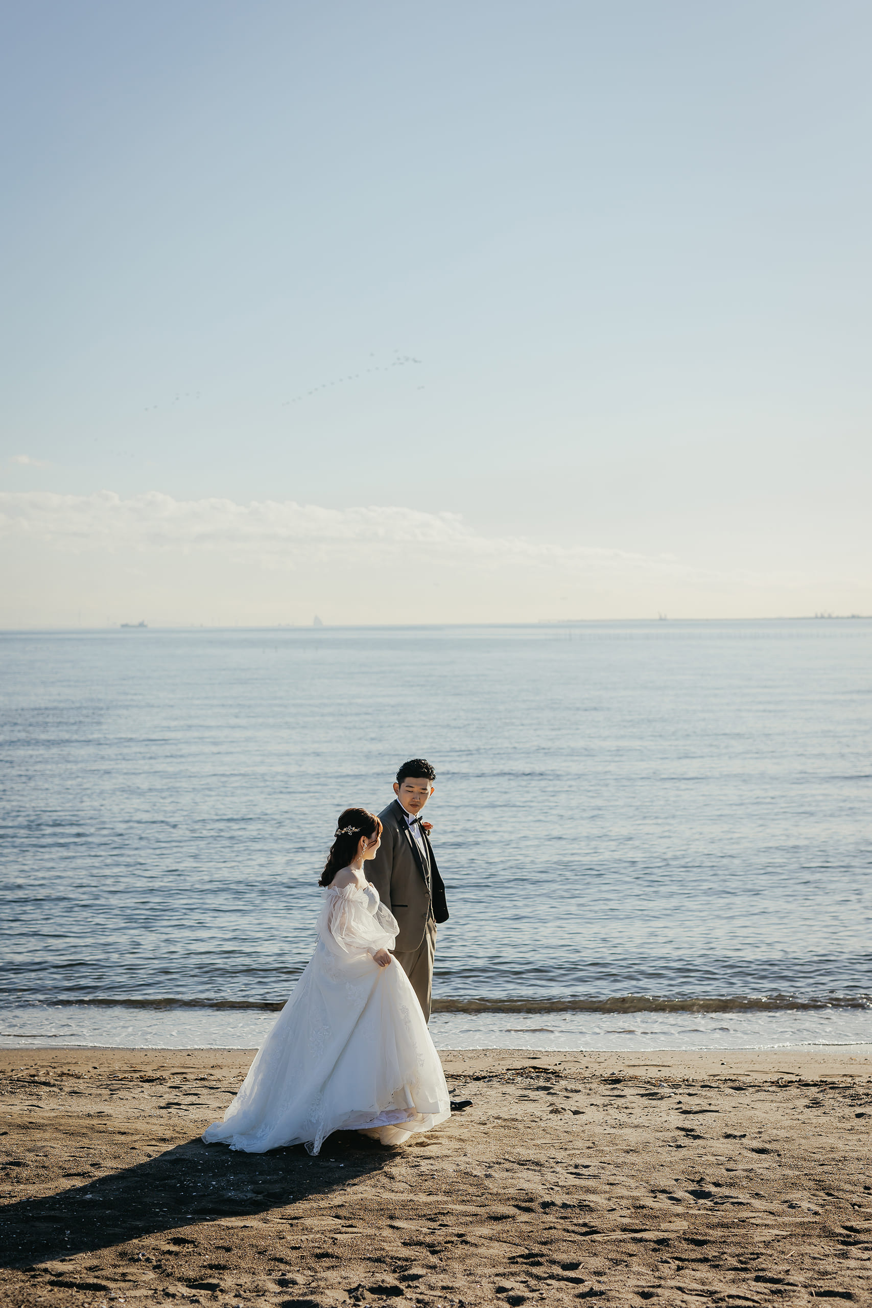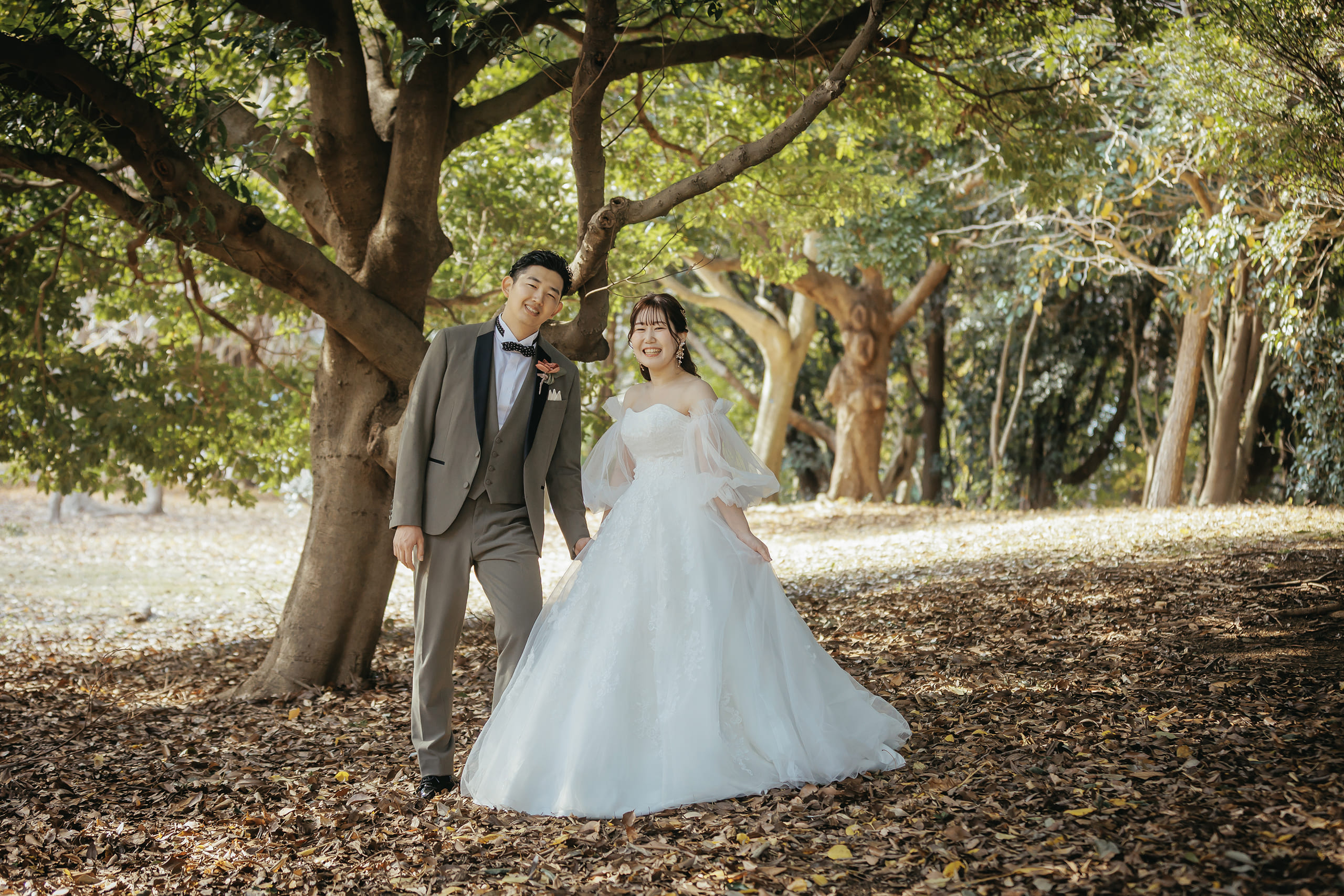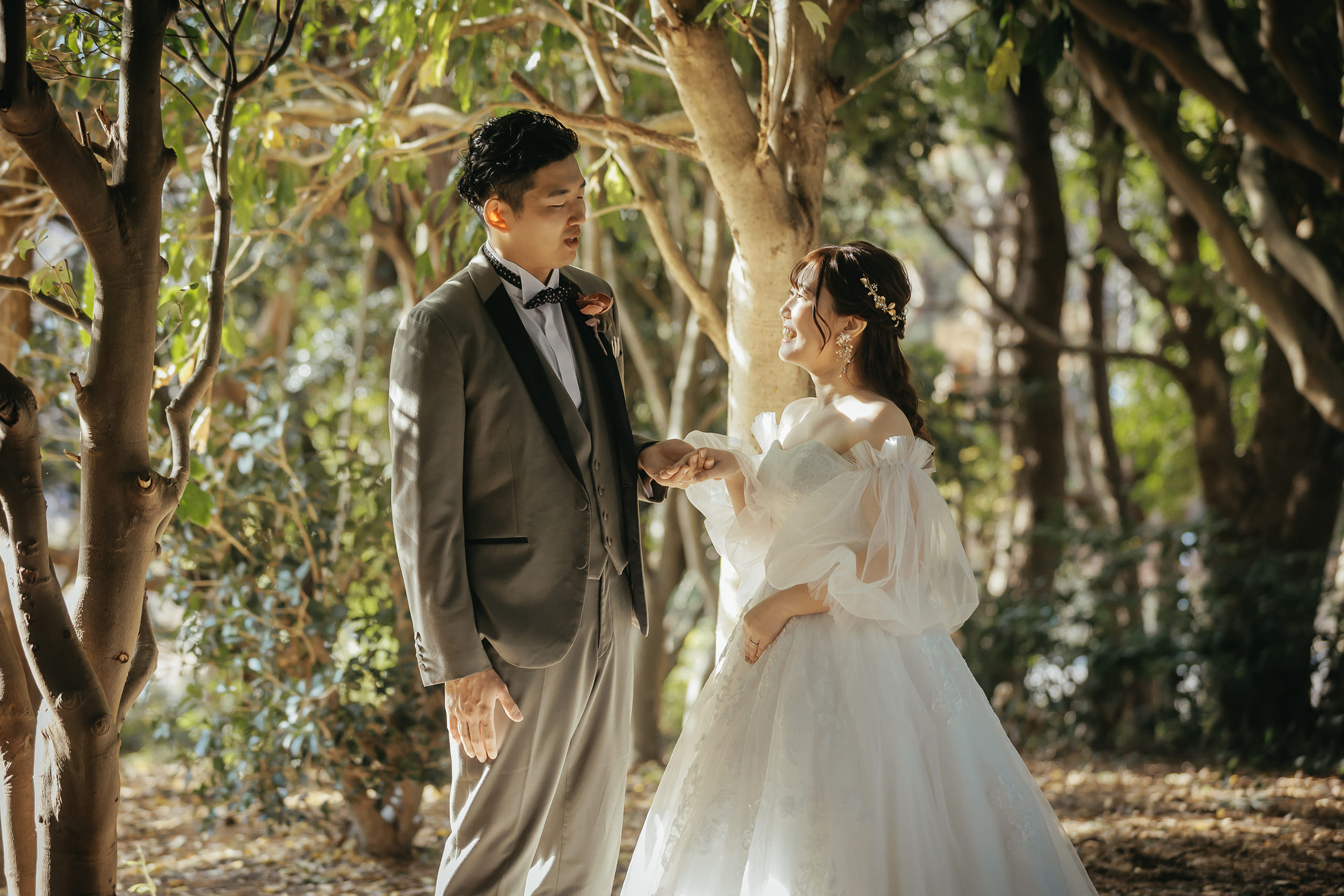 お手頃な価格でありながら、ドレス・タキシードが追加料金なしで自由に選べる点や、HPに掲載されている写真のクオリティの高さに惹かれてこちらのスタジオを選びました。 実際の撮影では、納品のスピードの早さにまず驚き、仕上がった写真のクオリティの高さに感動しました。森と海の2ロケーション撮影で、時間が足りるか不安もありましたが、カメラマンの的確で無駄のない撮影スタイルにより、短時間でも確実に素晴らしいカットを残していただけました。 撮影に慣れていない私たちでしたが、カメラマンとヘアメイクさんの温かい声掛けのおかげで自然と緊張がほぐれ、仕上がった写真はどれも良い表情で、とても満足のいくものになりました。希望していたカットもすべて叶えていただき、それ以上にたくさん撮影してもらえた点も嬉しかったです。 スタッフの対応も非常に丁寧で、マイページでのやり取りや確認が分かりやすく、不安なく準備を進めることができました。撮影前日に急な撮影リクエストをお願いした際も快く対応してくださり、本当に感謝しています。 衣装やヘアメイクも種類が豊富で、事前にHPやInstagramで確認できたのも安心材料でした。当日はヘアメイクさんが撮影に同行してくださり、ロケーションごとに細やかに対応してもらえたのが心強かったです。 価格、クオリティ、対応すべてにおいて満足度が高く、こちらのスタジオにお願いして本当に良かったと感じています。